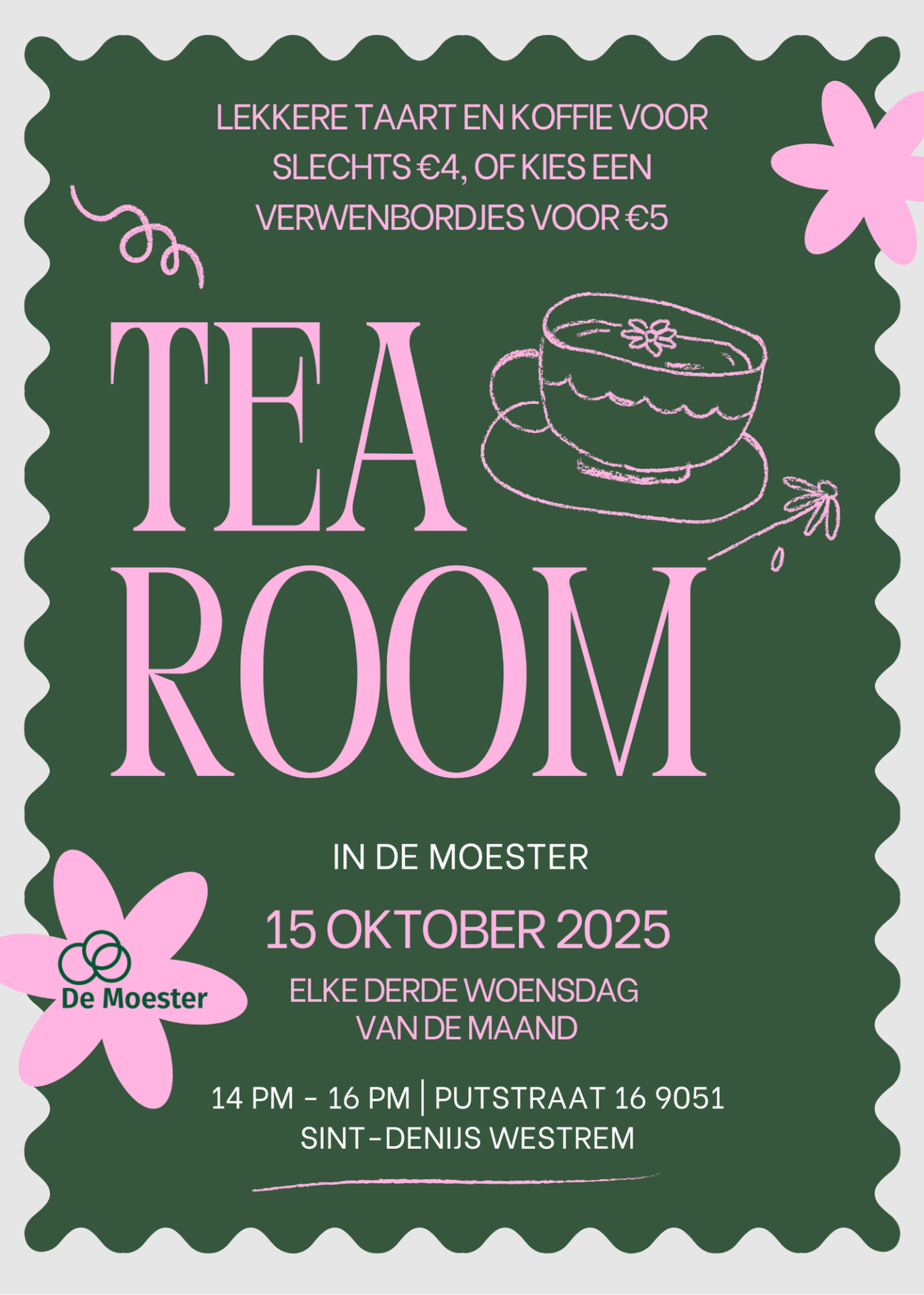 De maandelijkse Tea-room vindt plaats elke 3de woensdag van de maand. De bedoeling van de Tea-Room is dat we op deze namiddag de deuren openstellen voor mensen die niet als medewerker gekend zijn binnen de Moester.